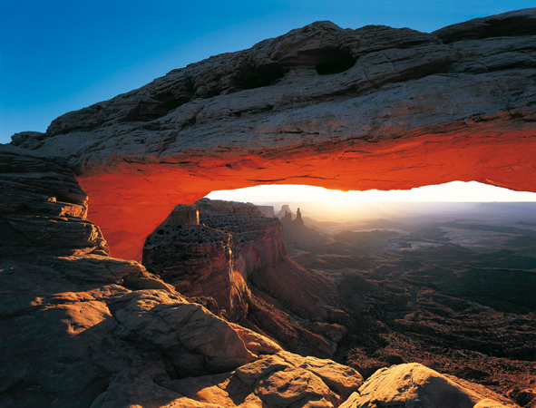 Wie sehr die Fotografie umgekehrt falsche Vorstellungen wecken kann, wurde mir am Mesa Arch bewusst. Mehrfach teilten mir Bekannte mit, wie enttäuscht sie waren, als sie diesen Steinbogen in natura sahen. Und tatsächlich, nur bei Sonnenaufgang und im Gegenlicht wirkt dieser Sandsteinbogen monumental und bildet einen exquisiten Rahmen für die Canyonlands ...