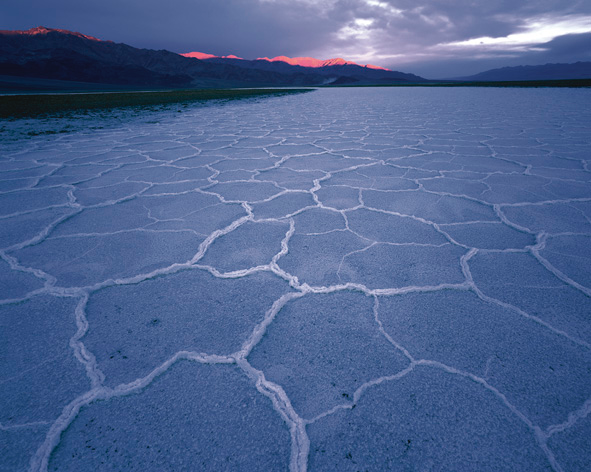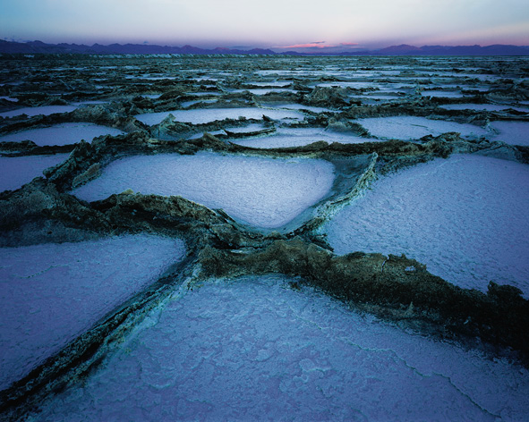 Mit ihren erstaunlich gleichmäßigen und oft sehr ästhetischen Strukturen könnte man diese Salzwelten ohne weiteres für "Land Art" halten - sich selbst organisierende Landschaftskunst. Der Boden vieler dieser Becken ist in fast gleichgroße Schollen aufgebrochen. Die dünnen Salzkrusten entstehen beim Verdunsten der letzten Feuchtigkeit und färben den lehmigen Boden hellgrau. Ausgetrocknete Salzseen werden auch Playas genannt; sie bilden die waagerechtesten aller Oberflächen der Erde und weisen auf einer Länge von mehreren Kilometern oft nur Höhenunterschiede von wenigen Zentimetern auf. Nicht von ungefähr werden auf solchen natürlichen "Pisten" immer wieder Geschwindigkeitsrekorde aufgestellt. Wenn man über eine derart plane Fläche geht, verstärkt sich der Eindruck von Weite und Gleichförmigkeit noch...