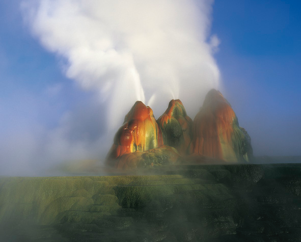 GENESIS kam auch mir in den Sinn, als ich das erste Mal vor dem wohl schönsten Geysir der Welt stand. Ich kenne die Geysire von Island und Neuseeland und habe auch mehrfach ihre berühmten "Kollegen" im Yellowstone National Park besucht. Aber eine derartige Formen- und Farbenpracht hatte ich nirgendwo gesehen. Hinzu kommt, dass der Fly Geysir als einer der wenigen auf der Welt eine permanente Fontäne ausstößt. Bis vor einigen Jahren wussten nur die wenigen Menschen, die in seiner Nähe leben, von ihm.
